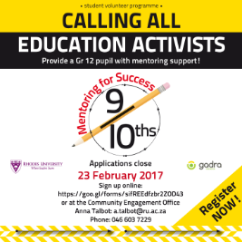 Nine Tenths is a mentoring programme geared towards equipping matric students in selected local schools to cope with their final year of school and to pass to their full potential. Pupils are given one-on-one attention from a Rhodes University student through nine guided and structured contact sessions.
