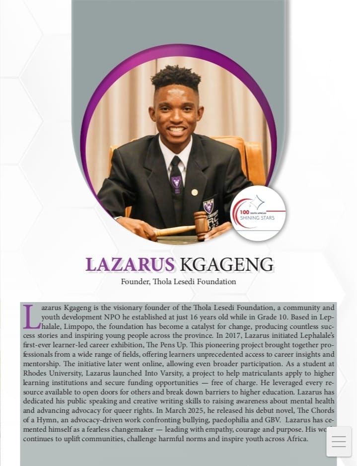 On the 19th of February, Lazarus Kgageng, an MA Candidate at the CSSR, was recognised as part of the 100 South African Shining Stars of 2025 by Inside Education and awarded the Civil Society Award.
