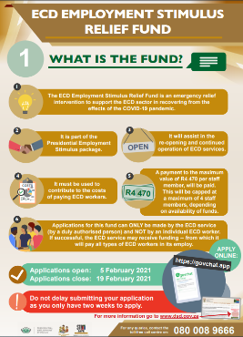 President's Stimulus Relief Fund CSD encourages all ECD practioners to urgently register for the President's Stimulus Relief Fund regardless of whether you are in a fully registered centre or not. See the below PDF for further information: President's Stimulus Relief Fund