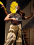 The actors are accompanied by two musicians who sit on a bench in the corner throughout and play a flute and a djembe drum. This represents a Hayashi which is a Japanese music group used in theatre. One assumes that the djembe drum is used to add an African influence.