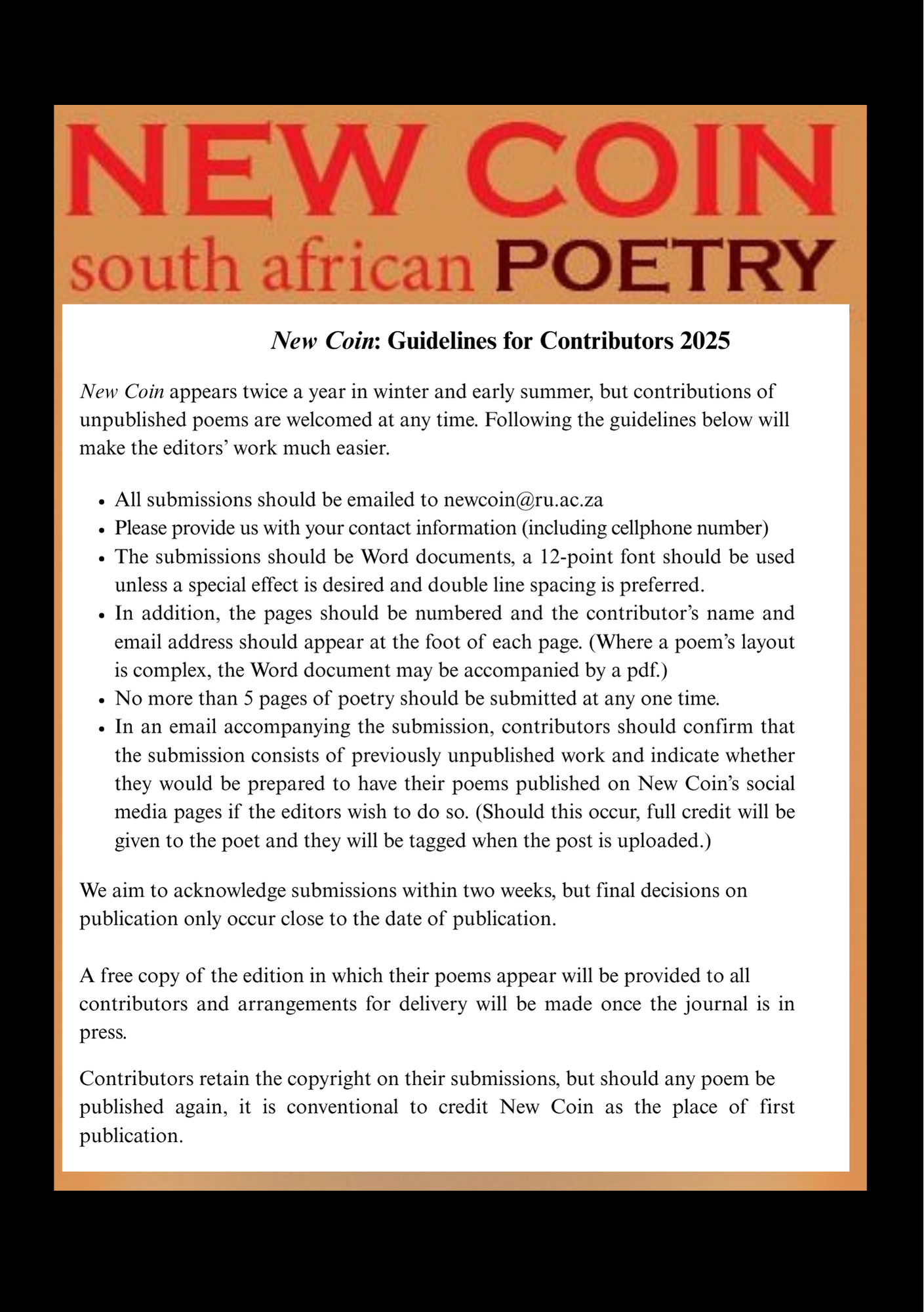 To order back issues of New Coin please email isea@ru.ac.za to find out whether we still have stock of the issues you require.