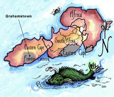 When I tell people about Grahamstown, I usually get the blank look.This is usually a reliable indicator that they haven't a clue. Grahamstown is about about an hour's drive to the North East of Port Elizabeth and lies on the escarpment overlooking the coastal plain. It is inland from Port Alfred and Kenton-on-sea, which is a place that doesn't occur on the news an awful lot. There are lots of nice maps over here.