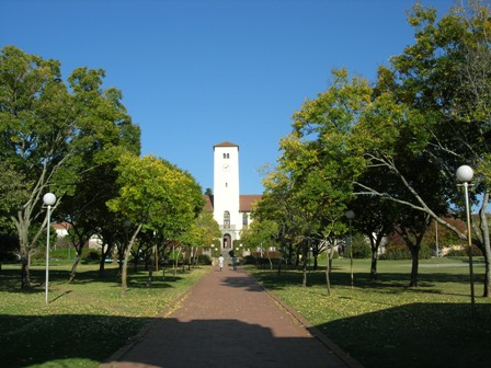 The entrance to the university in May (yes, that would be winter). Take special note of the sun and blue sky. Winter can be lovely.