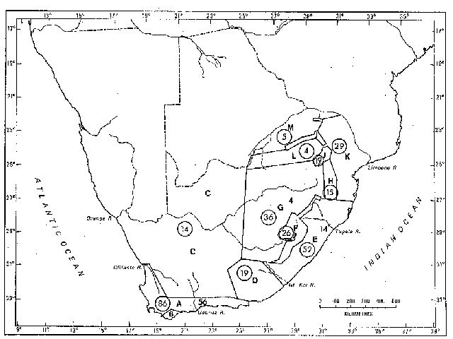 Distributions are indicated according to the twelve hydrobiological regions (A-M) proposed by AD Harrison (1959).
