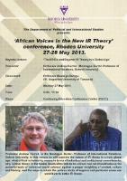 The Department of Political and International Studies invites the public to a plenary session of the "African Voices in New IR Theory" conference to be addressed by global IR scholar, Andrew Hurrell from Oxford University. He will talk on "The BRICS and Beyond: IR Theory in a Global Age" which will be followed by a comment on the address by the discussant, Prof. Mwesiga Baregu from St. Augustine, University of Tanzania.