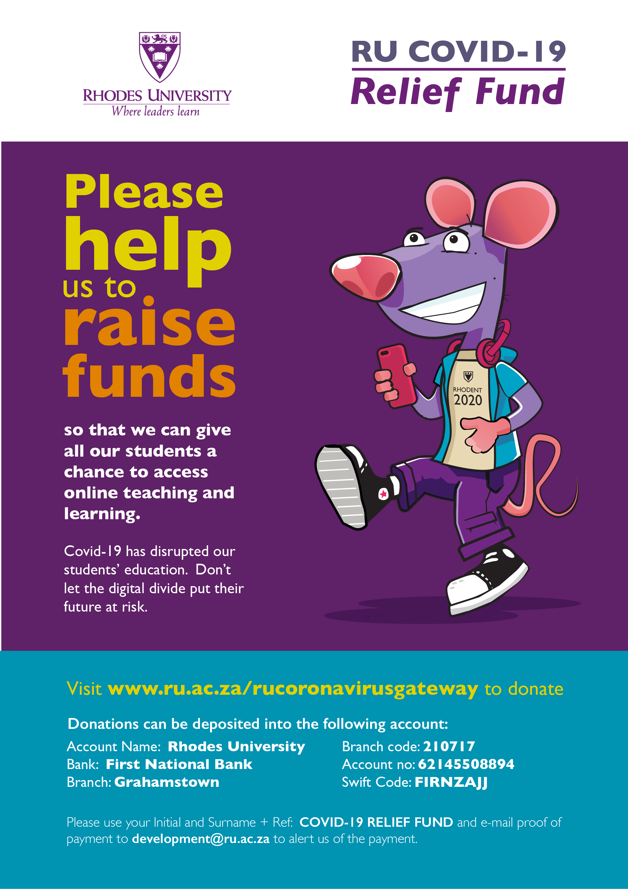 Please use your Initial and Surname + Ref: COVID-19 RELIEF FUND and e-mail proof of payment to development@ru.ac.za to alert us of the payment.